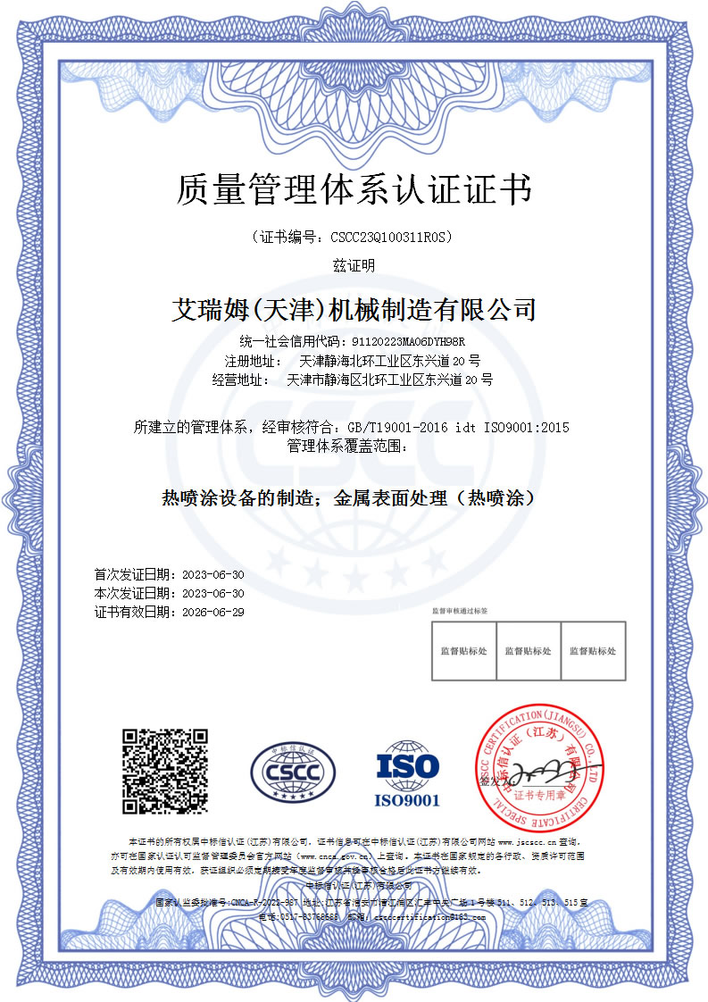 艾瑞姆(天津)機械制造有限公司是一家集熱噴涂設備研發、生產、銷售;耐磨、耐高溫、防腐現場施工為一體的專業性企業,是中國表面工程協會團體會員、全國熱噴涂協作組成員,擁有熱噴涂工程施工一級資質。